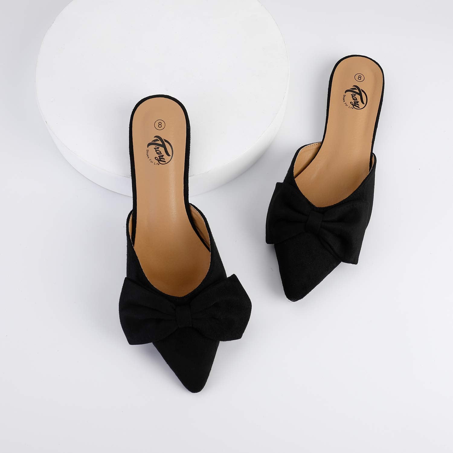 A dainty bow accent at the tapered pointed toe adds modern style to this pair. The Mule shoe goes well with any casual occasion.